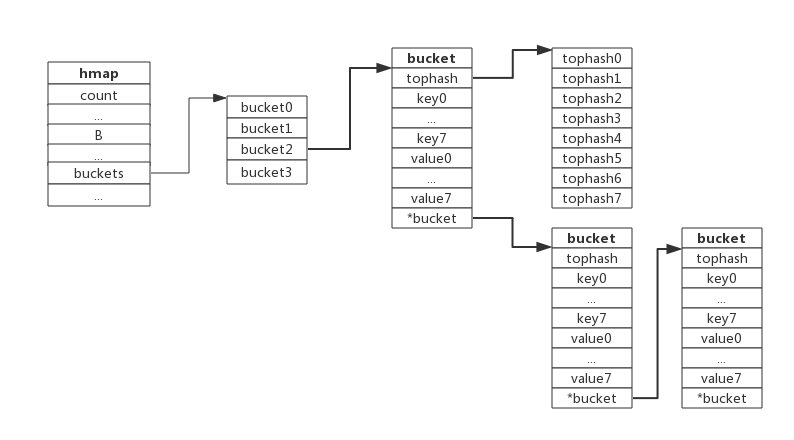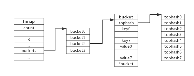 go使用链地址法来解决哈希冲突。每一个桶中可以存放8个键值对,当超出时,会由overflow指向下一个桶。这样就形成了一个桶链表。如下图所示: