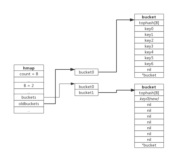 增量扩容增大B的大小,即每次至少扩大为2倍。假如当前为1个桶,扩容后变为2个,旧数据由oldbuckets指向。