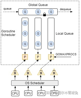 在新的调度器中依然有全局 G 队列,但功能已经被弱化了,当 M 执行 work stealing 从其他 P 偷不到 G 时,它可以从全局 G 队列获取 G。