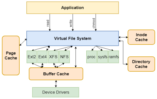 通过我们都是通过系统调用read、write等操作文件,实际上,这是一类统一的接口,具体操作是需要底层的文件系统来实现的。在Linux下,这层抽象就是VFS(Virtual File System),而Linux默认的文件系统是Ext文件系统,从Ext2到Ext4,处在迭代之中。当然由于VFS的存在,也可以操作其他文件系统,比如XFS,NTFS等,甚至LInux的内存中有一个proc的文件系统,实现了VFS的接口,这也是Linux一切皆文件思想的体现。整体布局如下。