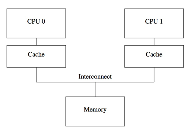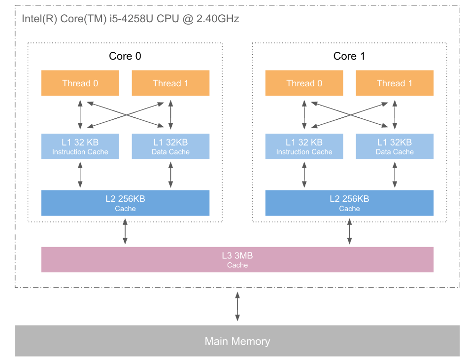 现代CPU一般都是多个核心的,每一个核心都拥有自己的缓存,通过总线与内存交互数据。两核实例如下